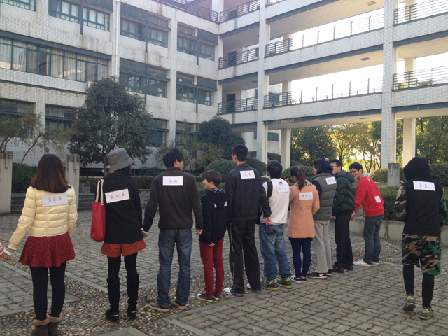 下午1点,全班同学陆续来到了东四附近的情人坡,全员到齐后,预先计划好的活动便开始了。活动主体由4个小游戏组成:首先,利用“眼色游戏选出3名胜者作为队长;并将大家分为3组,形成了分别由夏晨、黄章旦、赵厚力同学带领的第13组。之后,以组为单位依次进行了“绝对音感”、“青蛙跳”以及“闹钟谈话”的游戏。3个小组在这三个游戏中表现都非常活跃,并各有胜负,其中第3小组略微领先。紧接着,便是非常激烈的“撕名牌”游戏;我们在场地内互相追逐,互相用计,笑声不断。最终,经过半个多小时的你来我往,第1组后来居上,夺得了最后的冠军,并获得了冠军奖励。