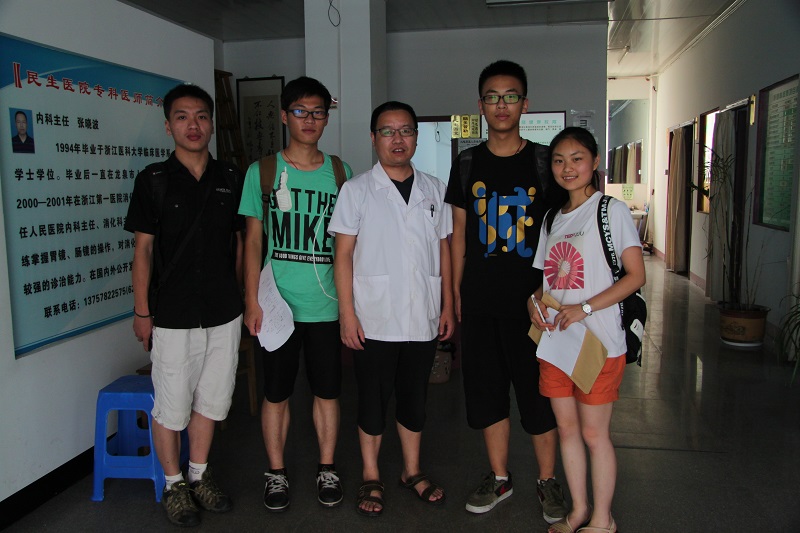 顶着毒辣的太阳,小分队继续向民生医院出发。他们要拜访的季炳招医生便是一位业务繁重的妇科专家。季奶奶非常热情,不仅和聊了她当年以工农兵身份进入浙江医科大学的特殊求学经历,还介绍了民生医院的创办经历。最后季奶奶还热情的还和小分队合影,并拥抱鼓励他们努力学习。在民生医院,小分队的队员们还找到了另外一位浙大的校友——龙泉民生医院消化内科张晓波主任。他也是民生医院的创办人之一。他和季奶奶一样也有很多的病人,在做完一个内科手术后,他顾不得休息便和队员们聊了起来。张医生一开始便很热情地介绍了在县城医院工作的医生的一些工作现状,接下来聊了他在来到民生医院之前的经历。张主任之前在市人民医院里面做了十年的消化内科,还当上了主任,不过后来他认为私立医院有发展前景,就和其他三个医生一起开了民生医院。民生医院从最初十几个人发展到了现在的九十几个人,也是一名医生别样的创业史。