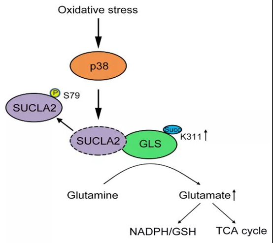 琥珀酰辅酶A合成酶亚基β (succinyl-CoA synthetase ADP-forming subunit β, SUCLA2)是琥珀酰辅酶A合成酶复合体的一个组分,可以将琥珀酰辅酶A分解为琥珀酸和辅酶A。研究发现,SUCLA2可以在线粒体内结合GLS,SUCLA2通过代谢反应降低了GLS周围局部的琥珀酰辅酶A的水平,从而降低了GLS的琥珀酰化修饰水平。而在氧化压力存在的条件下,激活的p38 MAP激酶介导了SUCLA2 S79位点的磷酸化,从而破坏了SUCLA2与GLS的相互作用,使SUCLA2与GLS解离,导致了GLS 周围局部琥珀酰辅酶A水平的升高,进而增加了GLS琥珀酰化修饰,促进了其活性。激活的GLS增加谷氨酰胺分解和还原性物质的产生,从而对抗氧化应激,促进肿瘤细胞存活和肿瘤生长。在临床样本中也发现,SUCLA2 pS79和GLS K311琥珀酰化水平呈正相关,与胰腺导管腺癌患者的临床分期和不良预后呈正相关。
